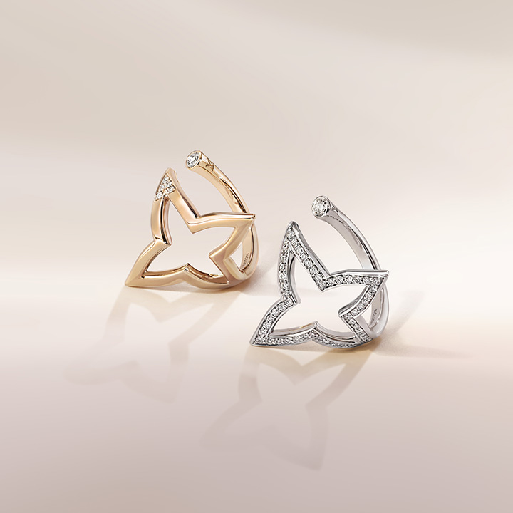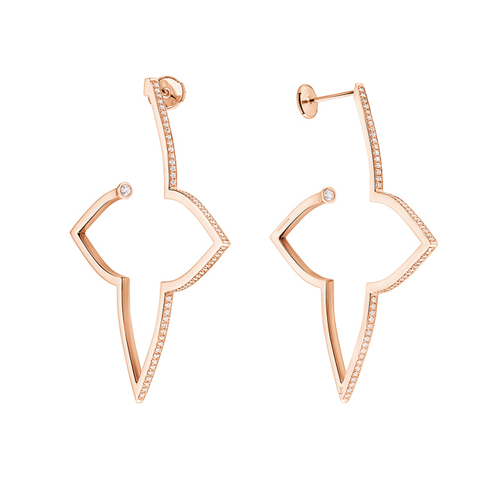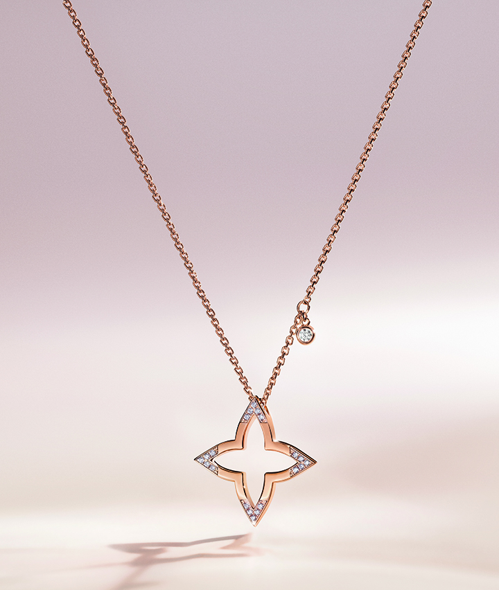 The Louis Vuitton Blossom jewellery collection, inspired by the Maison’s monogram flower, features 11 new pieces in pink or white gold ranging from delicate, stackable rings and pendants to an eye-catching overlap hoop and oversized, diamond-studded earrings. Solid and graphic but equally organic and wearable, they are designed to inspire creativity and personalisation to suit various moods and occasions. The rings and earrings are available in two sizes – the smaller creations are more classic and delicate, and the larger versions are more statement-making.